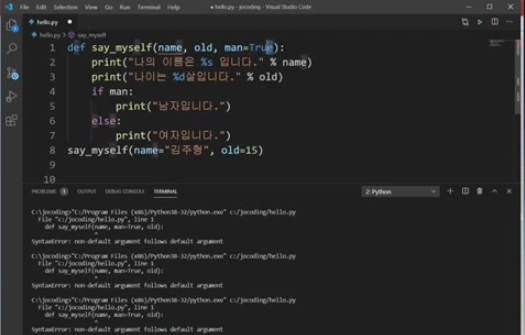- 따라서 def my_self(name, age, man=True):와 같이 기본값 매개변수는 항상 마지막에 두어야 한다.