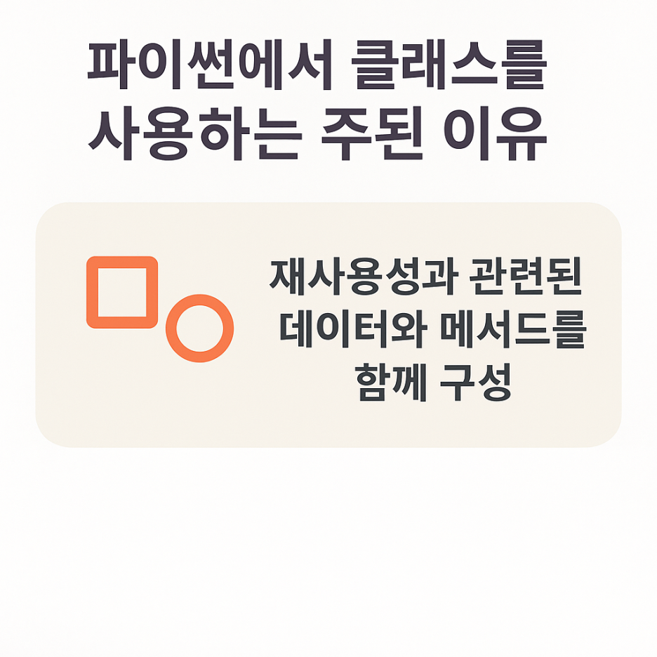 파이썬에서 클래스를 사용하는 주된 이유는 반복되는 변수와 메서드를 하나의 틀(설계도)로 묶어 미리 만들어 놓음으로써, 동일한 구조의 객체를 여러 개 생성할 때 효율적이기 때문 입니다.