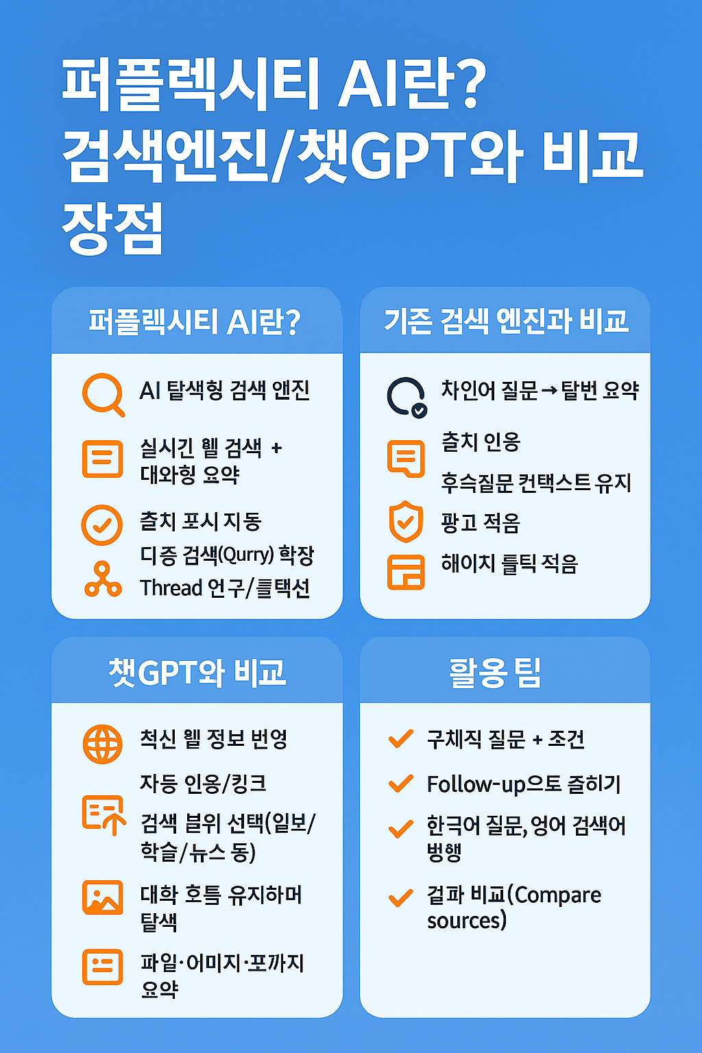 퍼플렉시티 AI는 어떤 도구이며, 기존 검색 엔진 및 챗GPT와 비교했을 때 어떤 장점이 있나요?
