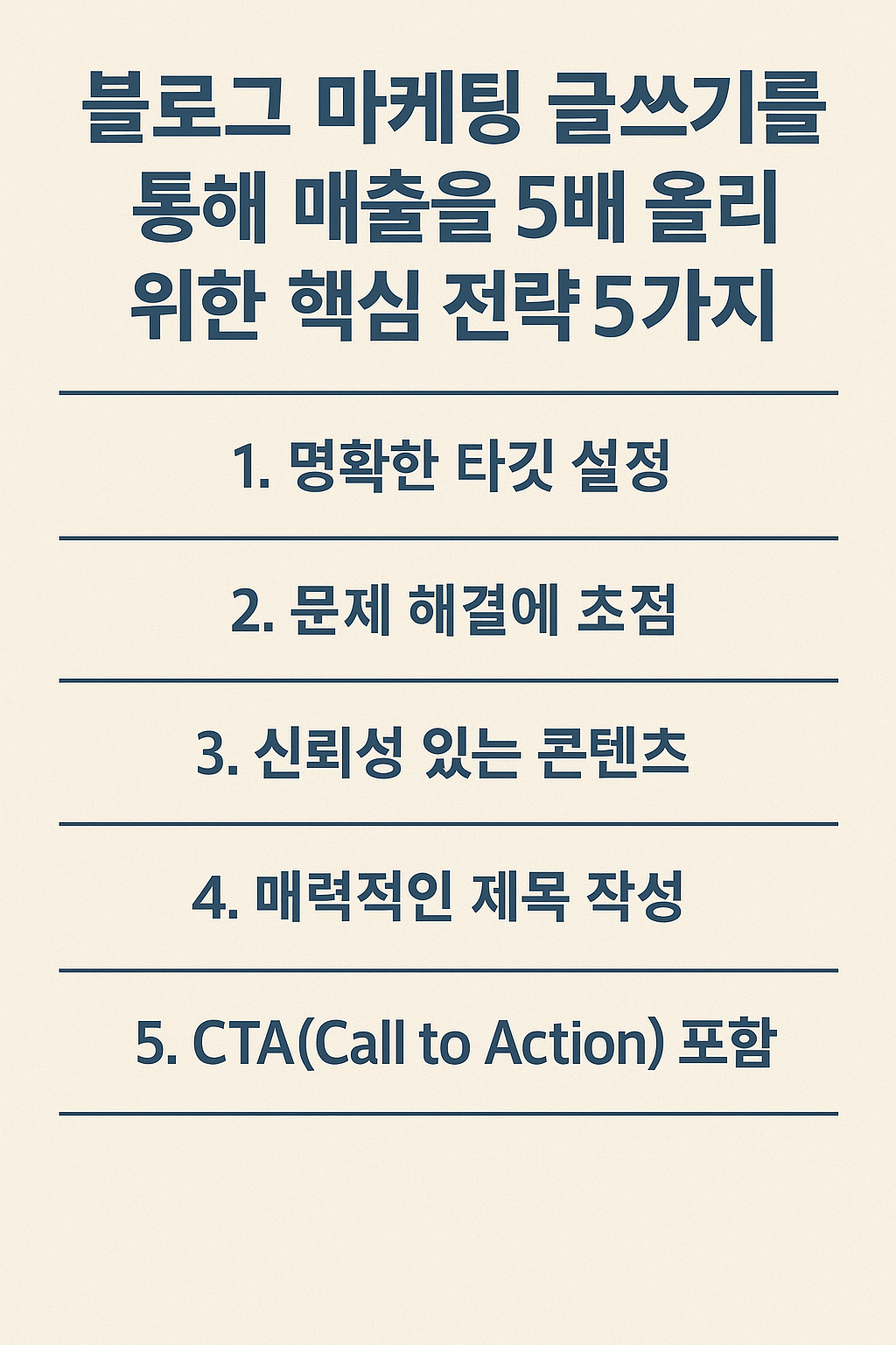 블로그 마케팅 글쓰기를 통해 매출을 5배 올리기 위한 핵심 전략 5가지는 무엇인가요?