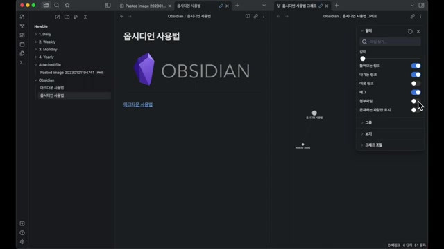 - 노트 연결 및 시각화: '[[노트 이름]]'을 통해 노트 간 연결이 가능하며, 그래프 뷰를 통해 전체 보관소 또는 특정 노트의 연결성을 시각적으로 확인할 수 있습니다 .