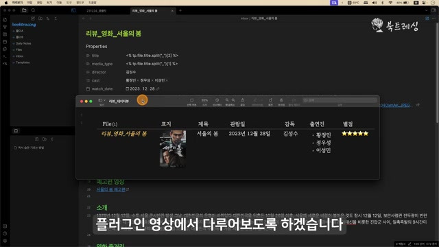 - 이는 '리뷰_영화_제목' 형식으로 노트를 만들고 템플릿을 적용하면 해당 정보가 자동으로 입력됨을 의미한다.