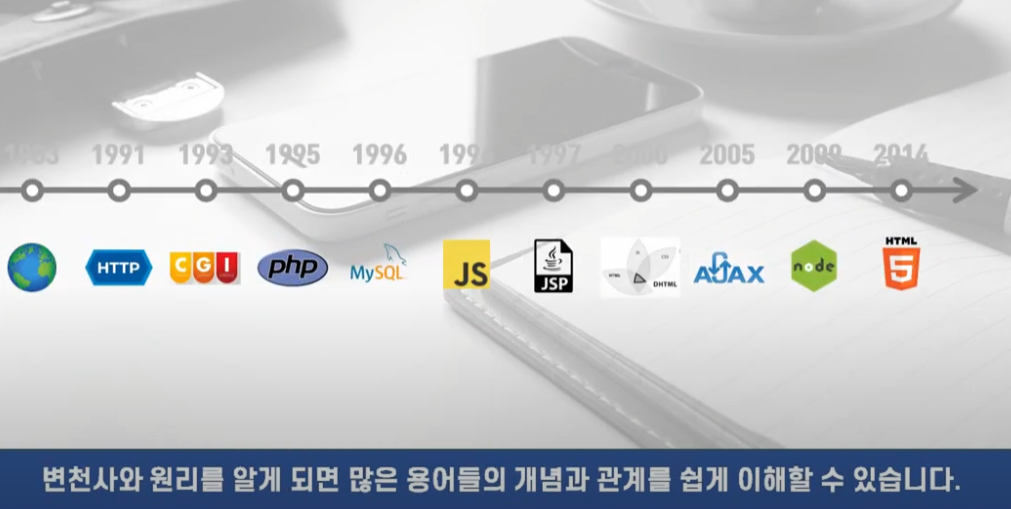 웹은 1991년 유럽입자물리연구소의 팀 버너스 리가 연구소 내 효율적인 자료 공유를 위해 HTTP 프로토콜과 WWW(World Wide Web)를 제안하며 탄생 했으며 , 초기에는 정적인 HTML 문서 출력 기능만 제공했으나 , CGI와 HTTP 1.0의 등장으로 동적인 웹 시대가 열렸고 , PHP, MySQL 등의 기술 발전과 함께 웹 애플리케이션 개념이 생겨나며 다양한 서비스가 가능해졌습니다 .