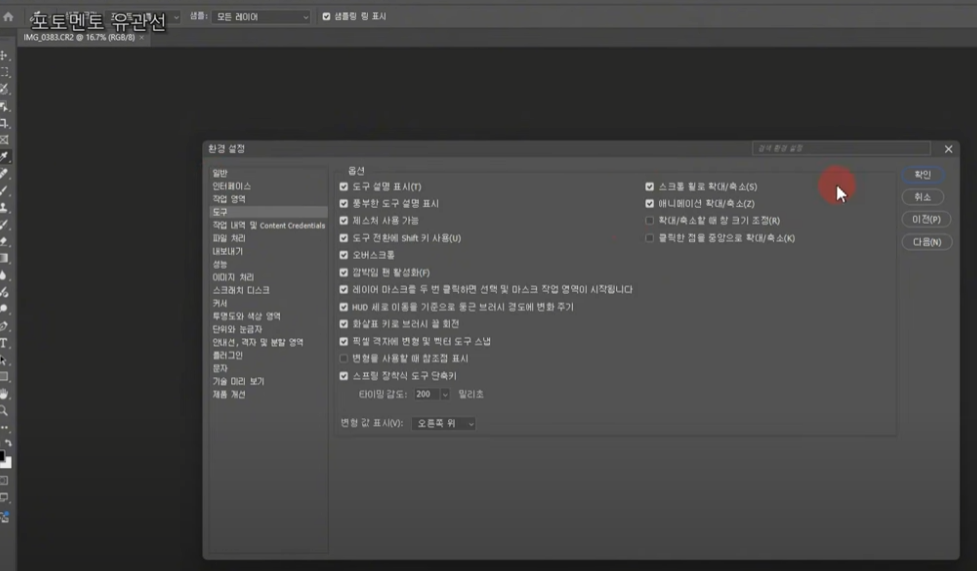 스크롤 휠 확대/축소 설정: 도구(Tools) 설정에서 마우스 스크롤 휠로 확대/축소를 할 수 있도록 설정하면 작업이 매우 편리해진다.