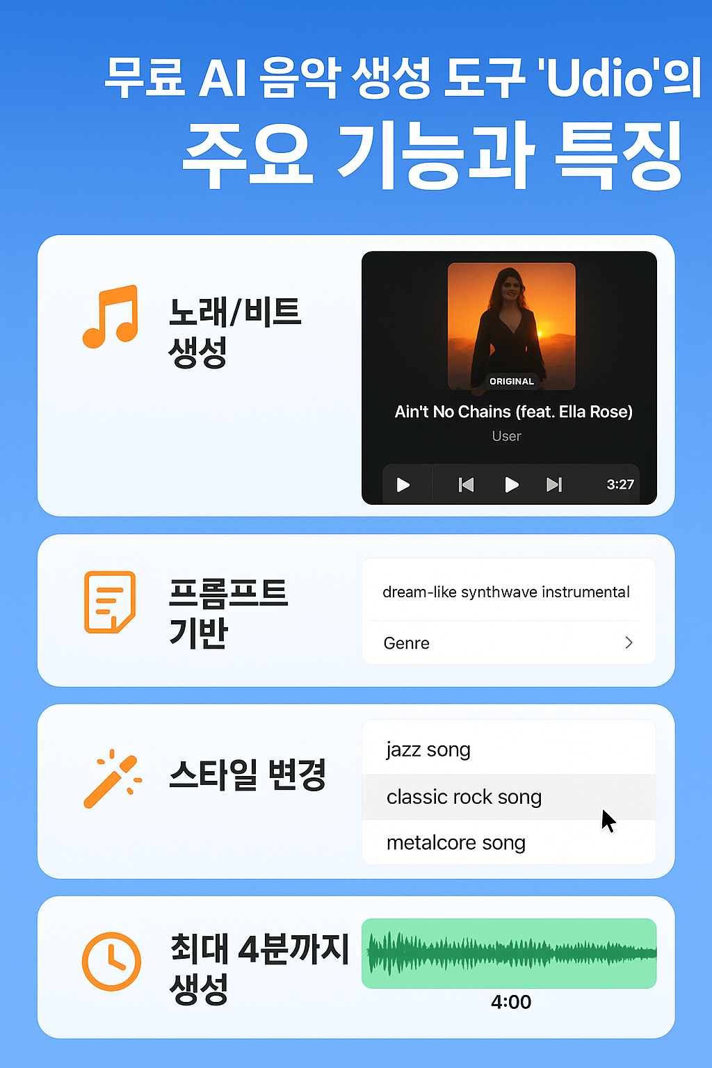 "이 포스팅은 쿠팡 파트너스 활동의 일환으로, 이에 따른 일정액의 수수료를 제공받습니다."무료 AI 음악 생성 도구 'Udio'의 주요 기능과 특징은 무엇인가요?Udio는 텍스트 프롬프트만으로 다양한 장르의 음악을 생성하며, 가사 자동 생성 및 직관적인 인터페이스를 제공 하여 누구나 쉽게 작곡가처럼 음악을 만들 수 있습니다Udio 사용 시 주의할 점은 무엇인가요?한국어 프롬프트는 결과가 예상과 다를 수 있으므로 영어로 작성하는 것이 좋습니다무료 사용 시 생성된 음악의 출처를 'Creator with Udio'라고 표기해야 합니다이 콘텐츠는 AI 음악 생성 도구 'Udio'를 활용하여 누구나 쉽게 자신만의 음악을 만들 수 있는 방법을 상세히 안내합니다. 텍스트 프롬프트만으로 다양한 장르의 음악, 심지어 가..