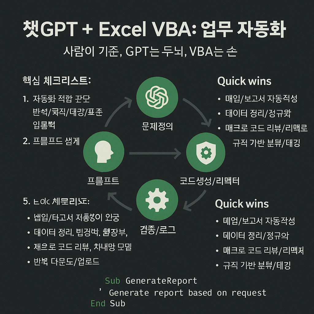"이 포스팅은 쿠팡 파트너스 활동의 일환으로, 이에 따른 일정액의 수수료를 제공받습니다."챗GPT와 엑셀 VBA를 활용한 업무 자동화의 핵심은 무엇인가?코딩 지식이 없는 사람도 챗GPT와 같은 AI를 활용하여 VBA 코드를 쉽게 생성하고 적용하여 엑셀 업무를 자동화할 수 있다는 것 입니다 챗GPT를 활용한 VBA 코드 작성 시 주의할 점은?VBA 프롬프트는 단순하고 명확하게 작성해야 하며, 티키타카 방식보다는 한 번에 필요한 정보를 모두 제공하는 것이 좋습니다오류 발생 시에는 오류 메시지와 수정이 필요한 코드 부분을 정확히 알려주어 수정 요청을 해야 합니다엑셀 파일 저장 시에는 '매크로 사용 통합 문서' 형식으로 저장해야 VBA 코드가 유실되지 않습니다이 콘텐츠는 챗gpt와 엑셀 vba를 활용한 업무 ..